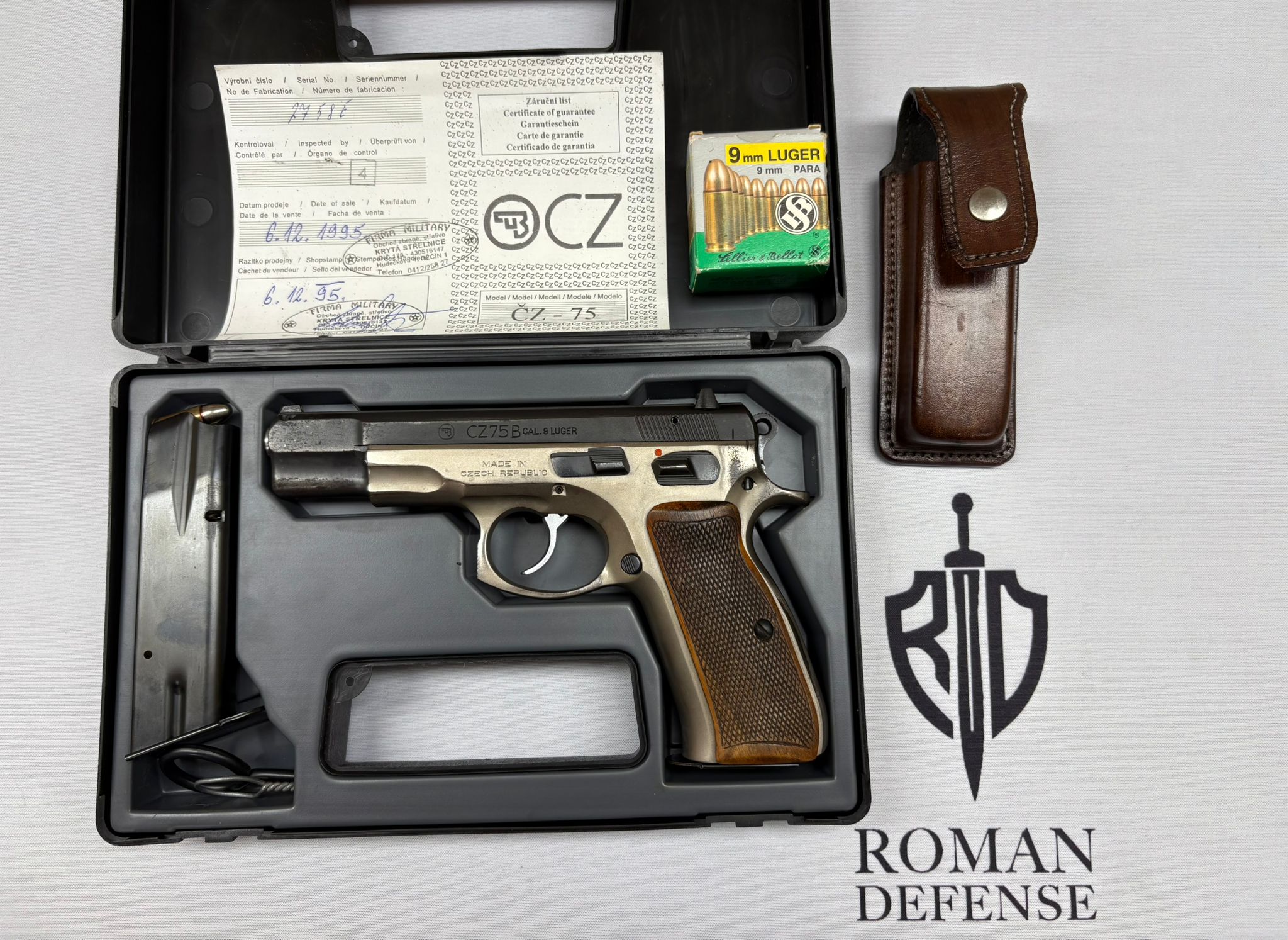 Zbraň prodávána v originálním plastovém kufru ,2x zásobník, kožené opaskové pouzdro na zásobník, 1x originální krabička nábojů 25ks + 15 ks v zásobníku, ke zbrani originální záruční list a paragon z roku 1995 (není na fotografiích kvůli osobním údajům).