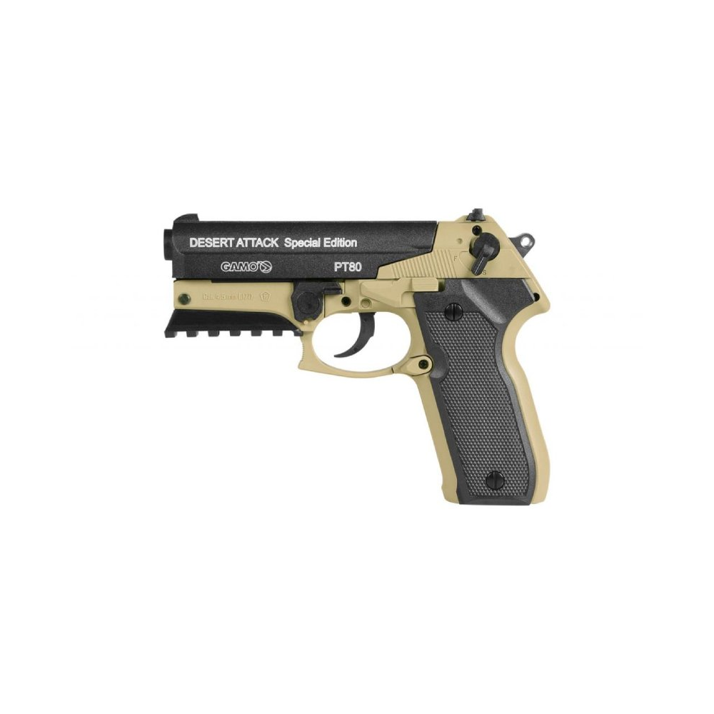 Gamo PT-80 DESERT ATTACK je vzduchová pistole poháněn CO2 bombičkami. Je vhodá pro sportovní i volnočasovu střelbu, ergonomická rukojet padne dobře do ruky a součástí balení je i (tlumič) prodloužení hlavně pro větší rychlost a přestnost střely.